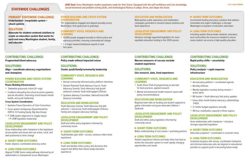 The League of Education Voters Foundation’s logic model is a roadmap for how our work drives systems change across Washington’s education landscape.